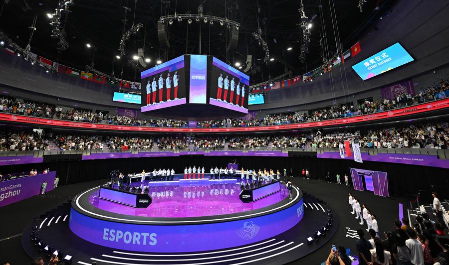 Medalhistas participam da cerim?nia de premia??o da vers?o dos Esports dos Jogos Asiáticos de Elite da Paz nos 19o Jogos Asiáticos, em 1o de outubro de 2023. (Foto: Yan Linyun/Xinhua)