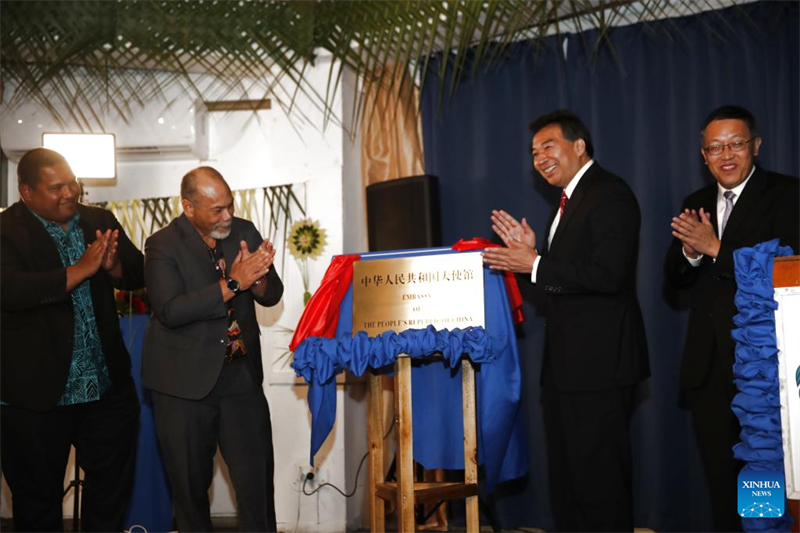 Uma placa da embaixada chinesa foi desvelada pelo ministro de Rela??es Exteriores e Comércio de Nauru, Lionel Aingimea, e por Luo Zhaohui, chefe da Agência de Coopera??o para o Desenvolvimento Internacional da China, que participou do evento como representante do governo chinês.