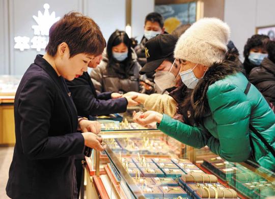 Os consumidores selecionam joias de ouro numa loja em Shenyang, província de Liaoning, em dezembro. (Foto: China Daily)