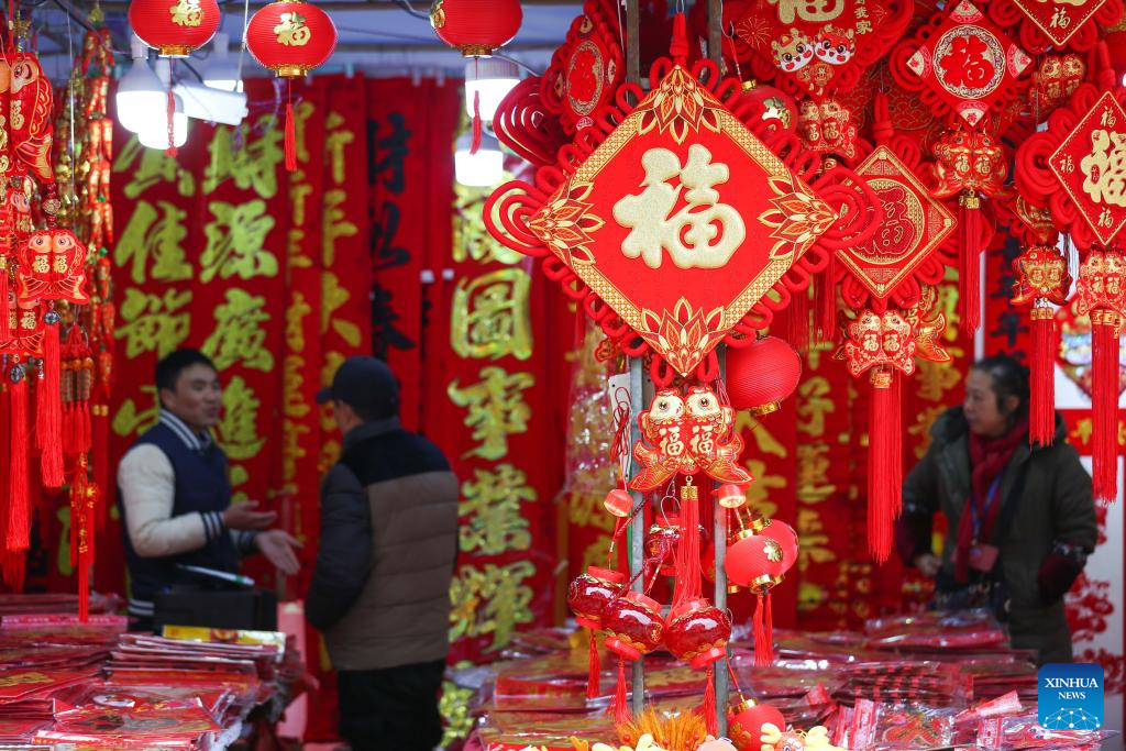 Consumidores escolhem decora??es do Ano Novo Lunar Chinês num mercado na cidade de Duyun, província de Guizhou, sudoeste da China, em 29 de janeiro de 2024. O Ano Novo Lunar Chinês, ou Festival da Primavera, cai em 10 de fevereiro deste ano. (Foto: Xiao Wei/Xinhua)