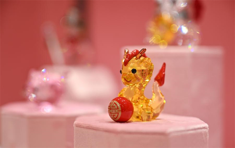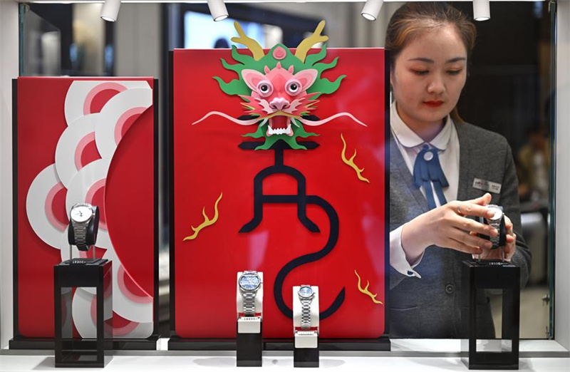 Um ornamento subordinado ao tema do drag?o é retratado na loja duty-free localizada em Mova Shopping Mall, em Haikou, Província de Hainan, sul da China, em 27 de janeiro de 2024. (Xinhua/Guo Cheng)