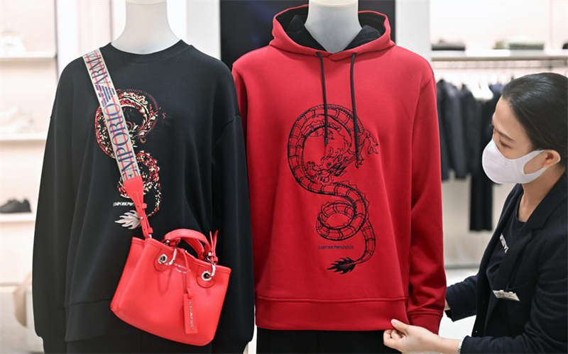 No balc?o da Emporio Armani, uma variedade de novos itens de vestuário feitos sob medida para o Ano do Drag?o ocuparam o centro das aten??es, incluindo moletons, camisas polo e jaquetas.