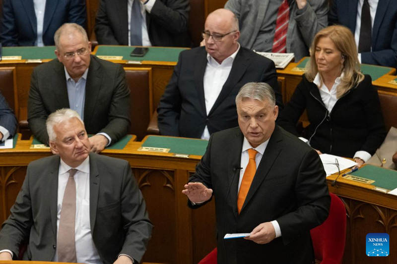 O primeiro-ministro húngaro, Viktor Orban, fala durante a sess?o de primavera do parlamento húngaro em Budapeste, Hungria, em 26 de fevereiro de 2024. (Foto de Attila Volgyi/Xinhua)