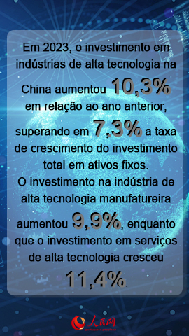 Em 2023, o investimento em indústrias de alta tecnologia na China aumentou 10,3% em rela??o ao ano anterior, superando em 7,3 pontos percentuais a taxa de crescimento do investimento total em ativos fixos. O investimento na indústria de alta tecnologia manufatureira aumentou 9,9%, enquanto que o investimento em servi?os de alta tecnologia cresceu 11,4%.