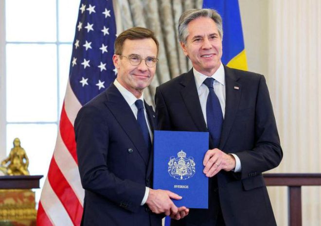 O secretário de Estado dos EUA, Anthony Blinken, e o primeiro-ministro sueco, Kristersson, organizaram uma cerim?nia no Departamento de Estado dos EUA, no dia 7, para depositar formalmente os documentos legais da ades?o da Suécia à OTAN, no Departamento de Estado dos EUA. O acontecimento marcou a ades?o oficial da Suécia ao organismo. ?
