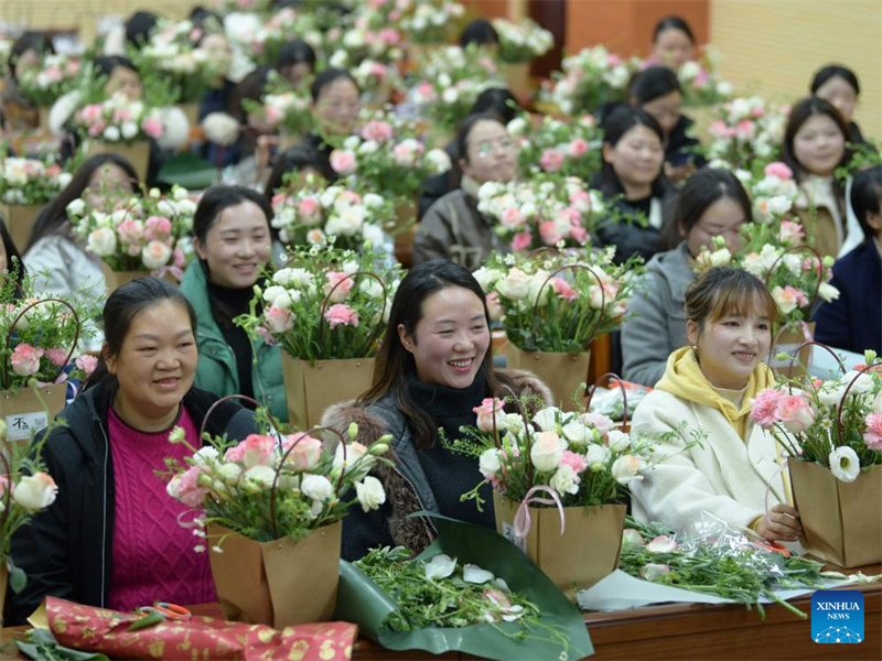 As membras da equipe fazem arranjos de flores na cidade de Bijie, na província de Guizhou, no sudoeste da China, em 8 de mar?o de 2024. Várias atividades foram realizadas em todo o país para celebrar o Dia Internacional da Mulher. (Foto de Yang Pinyi/Xinhua)