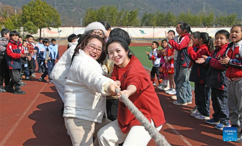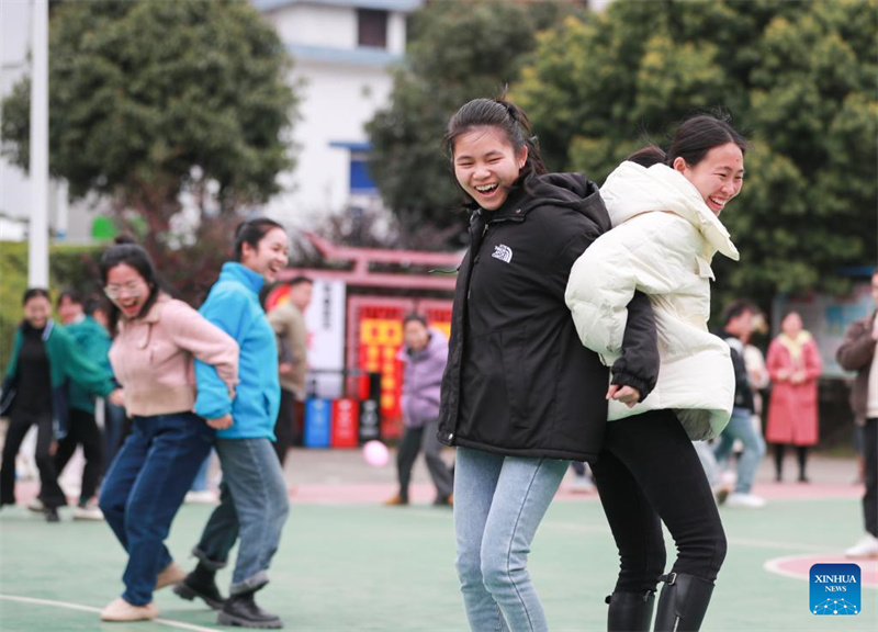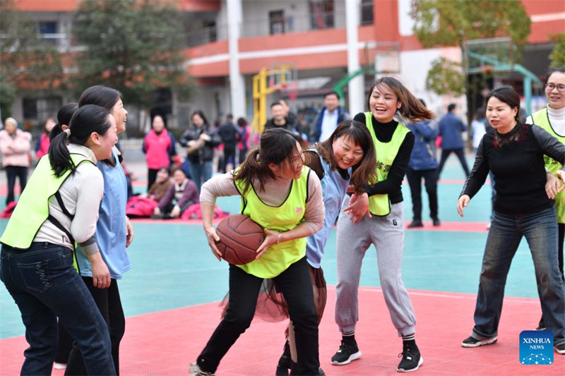 Professores participam de um jogo de basquete em uma escola primária no condado de Huangping, na Prefeitura Aut?noma Qiangdongnan das Etnias Dong e Miao, província de Guizhou, no sudoeste da China, em 8 de mar?o de 2024. Várias atividades foram realizadas em todo o país para celebrar o Dia Internacional da Mulher. (Foto de Liang Wen/Xinhua)
