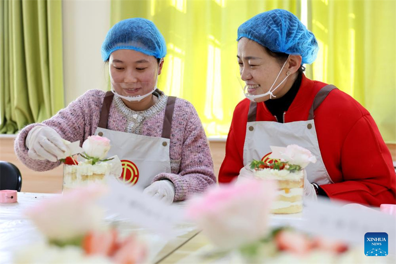 As funcionárias aprendem a fazer bolos em comemora??o ao Dia Internacional da Mulher no distrito de Shizhong, na cidade de Zaozhuang, província de Shandong, leste da China, 8 de mar?o de 2024. Várias atividades foram realizadas em todo o país para celebrar o Dia Internacional da Mulher. (Foto de Sun Zhongzhe/Xinhua)