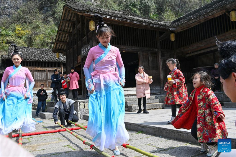 As mulheres participam dos jogos na aldeia de Liangtian, no condado de Congjiang, província de Guizhou, no sudoeste da China, em 8 de mar?o de 2024. Várias atividades foram realizadas em todo o país para celebrar o Dia Internacional da Mulher. (Foto de Luo Jinglai/Xinhua)