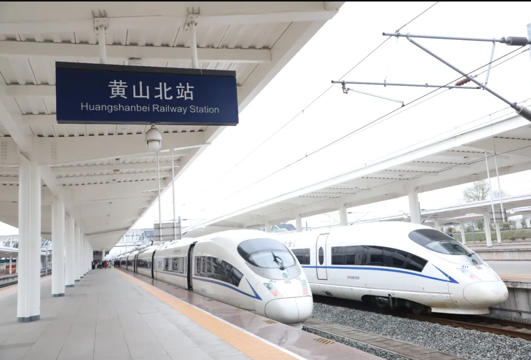 Trens-bala aguardam a partida na esta??o ferroviária de Huangshanbei. [Foto: Huangshan Daily]