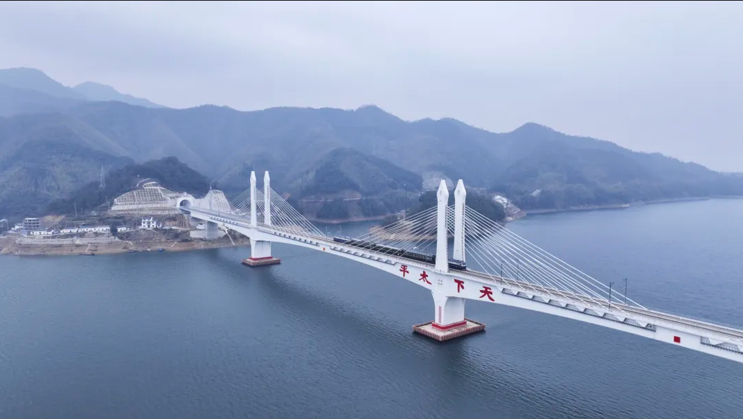 Um trem atravessa a ponte ferroviária construída acima do Lago Taiping, na província de Anhui. [Foto: Huangshan Daily]