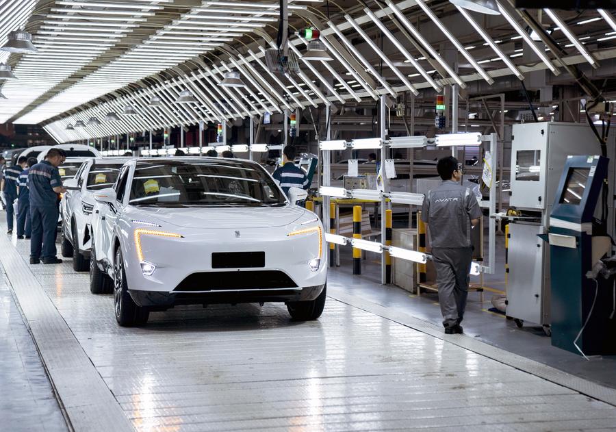 Trabalhadores est?o ocupados numa linha de produ??o do novo veículo energético AVATR numa oficina de Auto de Chang'na, no distrito de Jiangbei, município de Chongqing, sudoeste da China, em 20 de julho de 2023. (Foto: Li Qianlei/Xinhua)