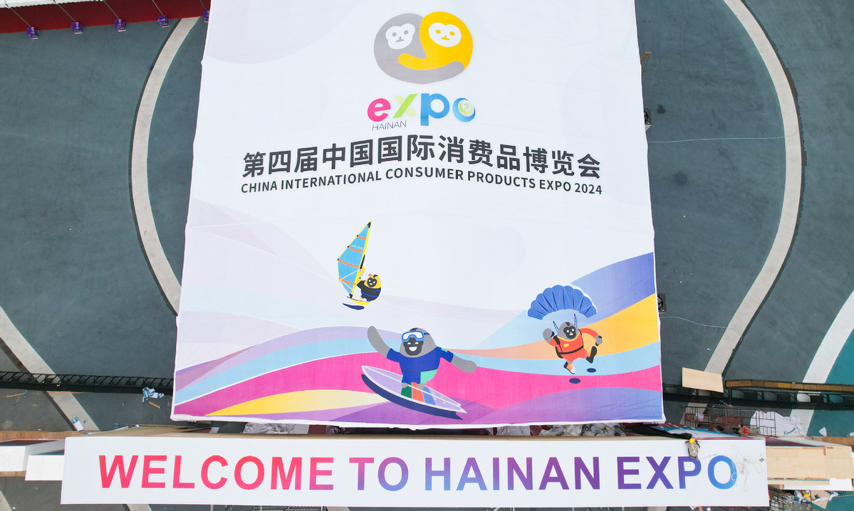 Trabalhadores exibindo marcas na entrada da quarta Exposi??o Internacional de Produtos de Consumo da China, no Centro Internacional de Conven??es e Exposi??es de Hainan, em Haikou, província de Hainan, em 8 de abril de 2024. (Foto: Xinhua)