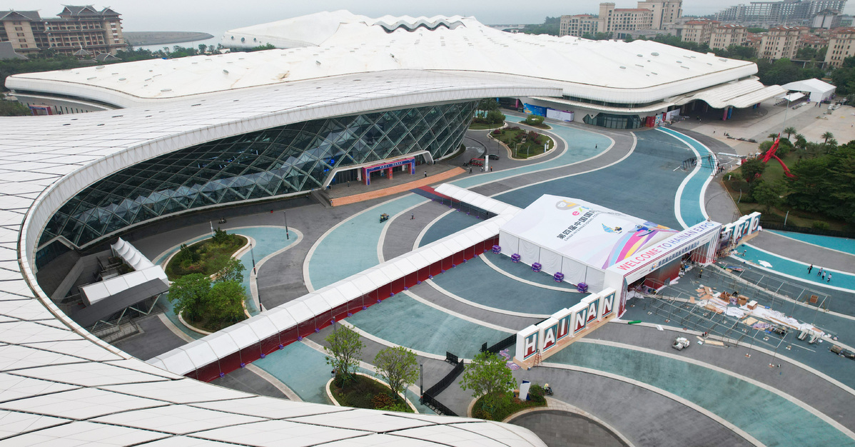 Vista aérea do Centro Internacional de Conven??es e Exposi??es de Hainan em Haikou, província de Hainan, em 8 de abril de 2024. (Foto: Xinhua)