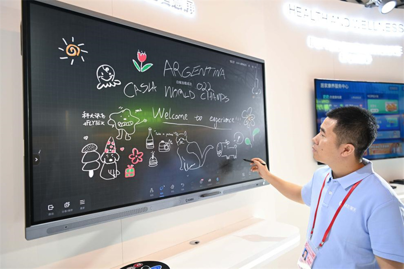 Um membro da equipe da iFLYTEK exibe uma tela inteligente na 135a sess?o da Feira de Importa??o e Exporta??o da China, também conhecida como Feira de Cant?o, em Guangzhou, província de Guangdong, sul da China, em 17 de abril de 2024. A 135a sess?o da Feira de Cant?o foi inaugurada na segunda-feira em Guangzhou. A zona de produtos inteligentes da feira atraiu cerca de 200 expositores e inúmeros visitantes (Foto: Deng Hua /Xinhua).