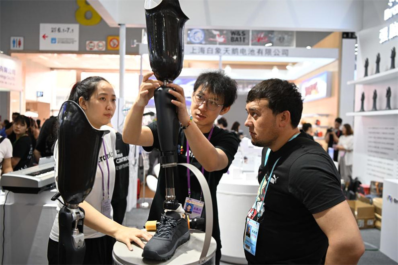 Um comprador estrangeiro aprende sobre uma perna bi?nica na 135a sess?o da Feira de Importa??o e Exporta??o da China, também conhecida como Feira de Cant?o, em Guangzhou, província de Guangdong, sul da China, em 17 de abril de 2024. A 135a sess?o da Feira de Cant?o foi inaugurada na segunda-feira em Guangzhou. A zona de produtos inteligentes da feira atraiu cerca de 200 expositores e inúmeros visitantes (Foto: Deng Hua /Xinhua).