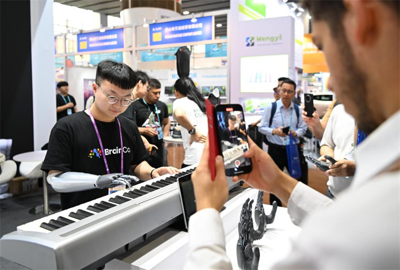 Um expositor usando um bra?o bi?nico toca teclado eletr?nico na 135a sess?o da Feira de Importa??o e Exporta??o da China, também conhecida como Feira de Cant?o, em Guangzhou, província de Guangdong, sul da China, em 17 de abril de 2024. A 135a sess?o da Feira de Cant?o foi inaugurada na segunda-feira em Guangzhou. A zona de produtos inteligentes da feira atraiu cerca de 200 expositores e inúmeros visitantes (Foto: Deng Hua /Xinhua).