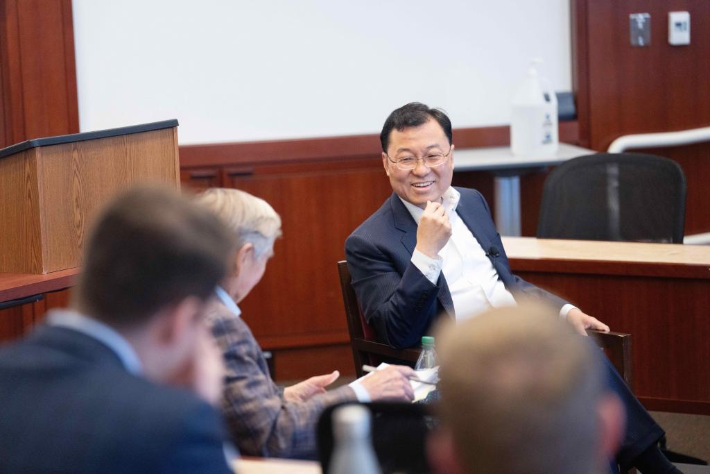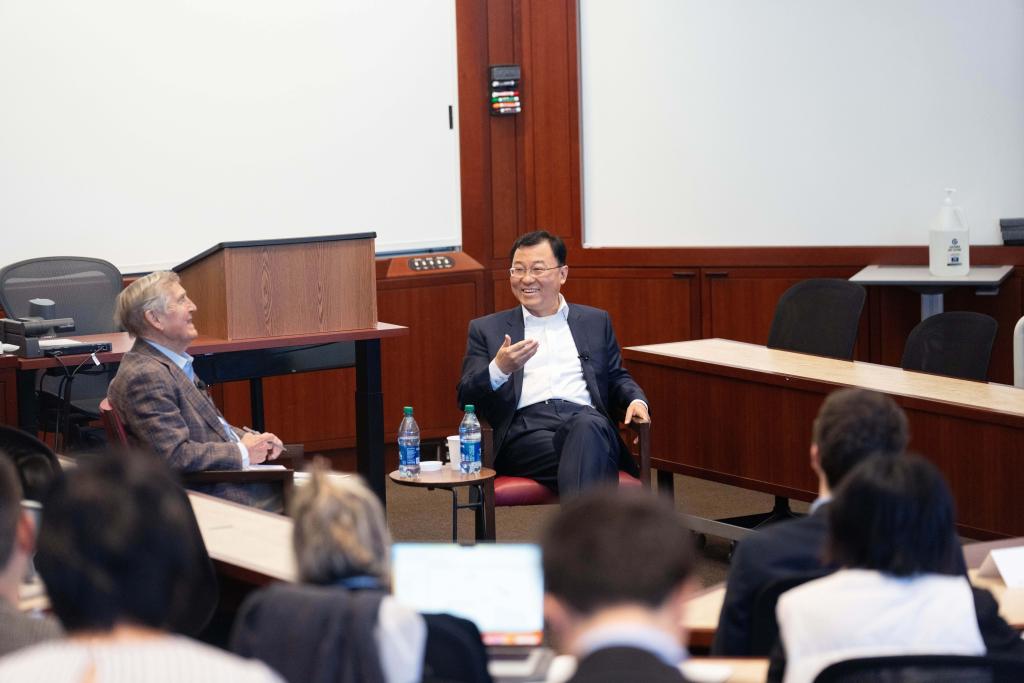 O embaixador chinês nos Estados Unidos, Xie Feng, fala durante um bate-papo ao lado do reitor fundador da Escola Harvard Kennedy, Graham Allison, na Universidade de Harvard em Cambridge, Massachusetts, Estados Unidos, em 19 de abril de 2024. (Foto: Liu Jie/Xinhua)