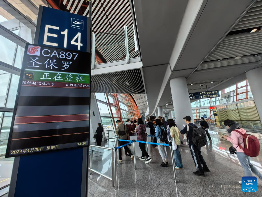 Passageiros embarcam no voo CA897 da Air China no Aeroporto Internacional Capital de Beijing, capital da China, em 28 de abril de 2024.