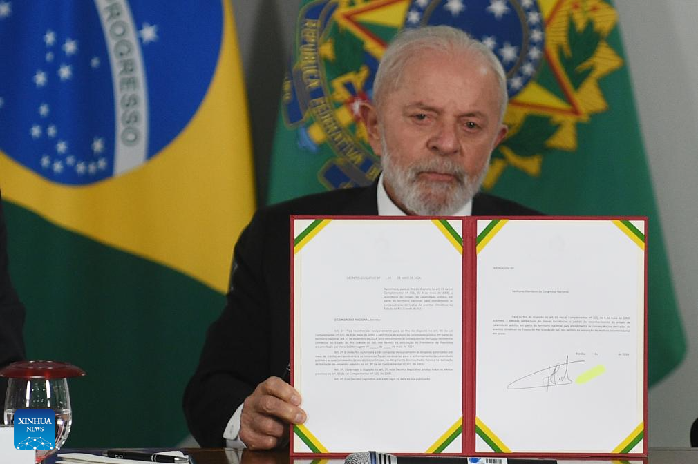 O presidente brasileiro, Luiz Inácio Lula da Silva, mostra o projeto de decreto legislativo para acelerar a transferência de recursos para o estado do Rio Grande do Sul, no Palácio do Planalto, em Brasília, Brasil, no dia 6 de maio de 2024. (Foto: Lúcio Távora/Xinhua)