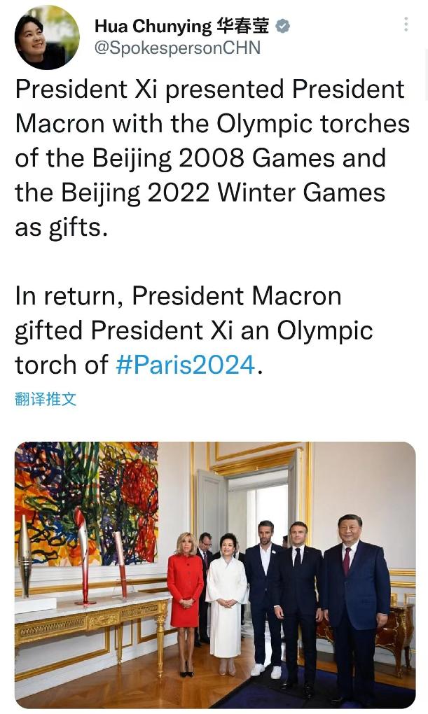 As que Xi presenteou a Macron foram as tochas olímpicas dos Jogos Olímpicos de Beijing 2008 e dos Jogos Olímpicos de Inverno de Beijing 2022.
