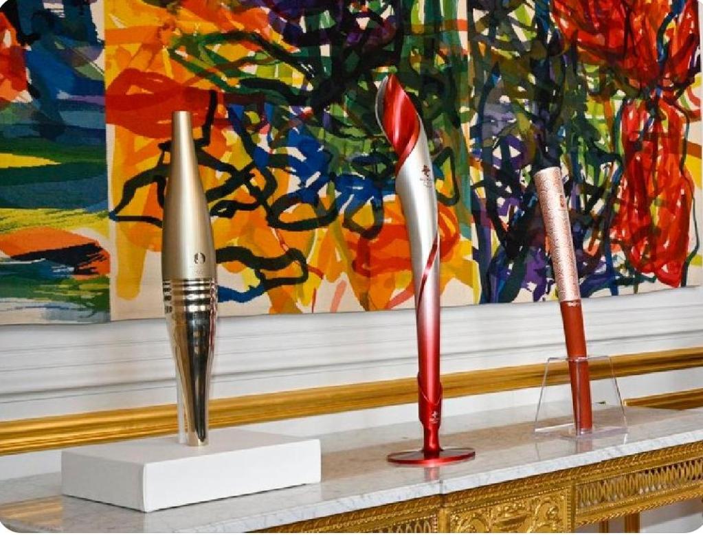 Entre os presentes, três tochas olímpicas eram particularmente atraentes, que estavam lado a lado em uma mesa de mármore branco na iluminada Sala de Retratos do Palácio do Eliseu.