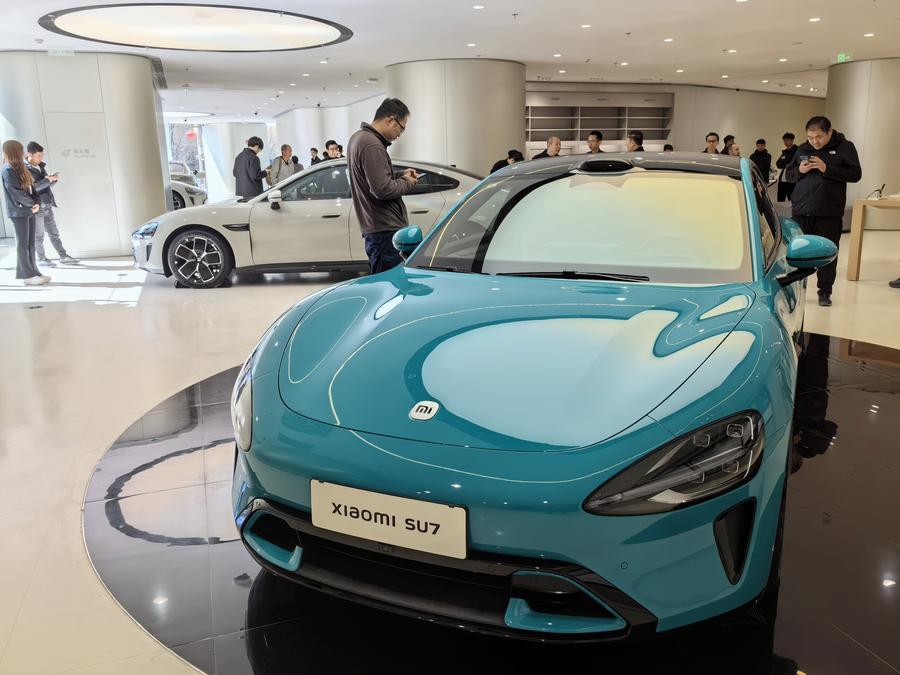 Consumidores observam o novo veículo elétrico modelo SU7 da Xiaomi numa loja de varejo em Beijing, capital da China, em 28 de mar?o de 2024. (Foto: Ju Huanzong/Xinhua)