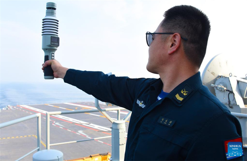 Um membro da equipe realiza dete??o meteorológica manual no convés do Fujian, o terceiro porta-avi?es da China, em 7 de maio de 2024. (Li Yun/Xinhua)