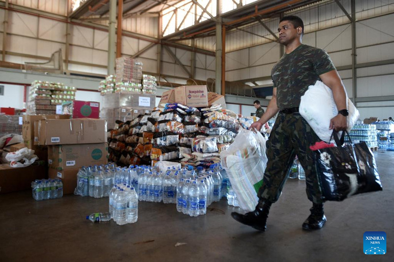 Um soldado da For?a Aérea Brasileira (FAB) transporta doa??es recebidas para serem entregues às vítimas das enchentes no Rio Grande do Sul, na Base Aérea de Brasília, em Brasília, Brasil, em 8 de maio de 2024. Pelo menos 100 pessoas perderam a vida e quase 100 mil casas foram destruídas ou significativamente danificadas devido às intensas chuvas e inunda??es registradas há mais de uma semana no estado do Rio Grande do Sul, regi?o sul do Brasil, segundo o balan?o divulgado na quarta-feira pelas autoridades locais. (Foto: Lúcio Távora/Xinhua)