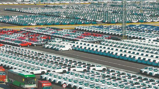 Os veículos est?o alinhados para exporta??o no Terminal Automotivo Internacional Haitong, no Porto de Taicang, província de Jiangsu, em 1o de dezembro. (Foto: Ji Haixin/China Daily)