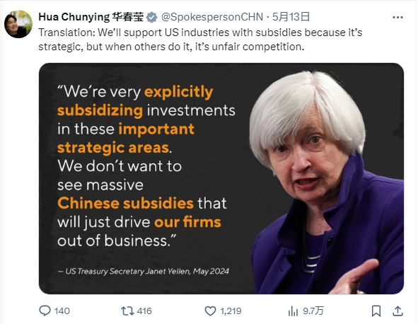 O governo dos EUA “apoia as indústrias dos EUA com subsídios porque é estratégico, mas quando outros o fazem, é uma concorrência desleal”, disse Hua no X.