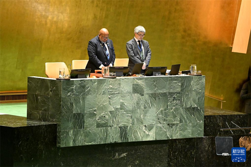 No dia 23 de maio, na Sede das Na??es Unidas, em Nova Iorque, Dennis Francis (à esquerda), Presidente da 78a Assembleia Geral das Na??es Unidas, presidiu a um momento de silêncio. Foto: Agência de Notícias Xinhua
