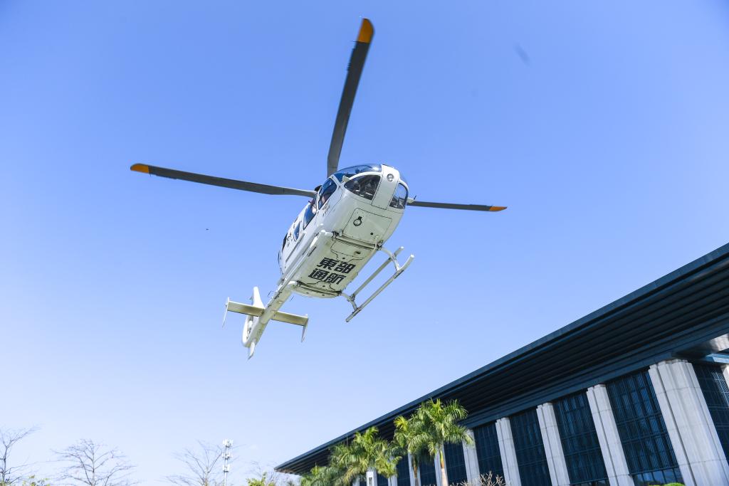 Um helicóptero decola em dire??o ao ?CBD Futian, do Centro de Conven??es e Exposi??es do Lago Yanzi em Pingshan, Shenzhen, em 10 de janeiro de 2024. (Foto: Mao Siqian/Agência de Notícias Xinhua)