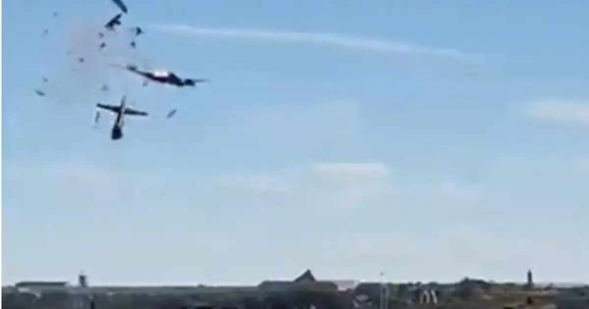 Imagens do acidente transmitidas pela CMTV, uma rede de TV local, mostram uma das aeronaves de um grupo de seis caindo verticalmente e se chocando, causando uma forte explos?o, enquanto outra atinge o solo horizontalmente.