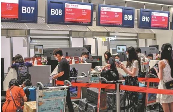 Passageiros com destino a Sydney fazem fila para o check-in no Aeroporto Internacional Haikou Meilan, na província de Hainan. (Luo Yunfei/China News Service)