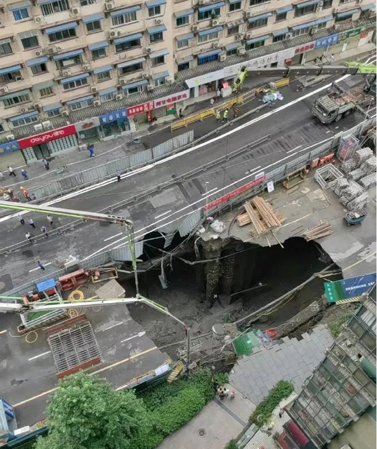 Uma estrada desmorona perto do canteiro de obras da Linha 13 do Metr? em Chengdu, província de Sichuan, em 21 de junho. (Foto: Nanfang Daily)