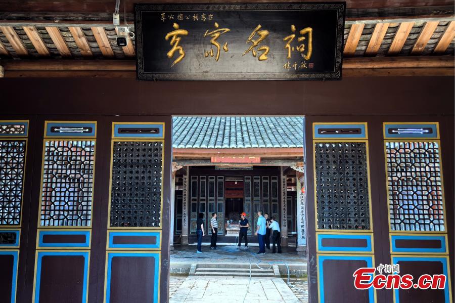 As autoridades locais e especialistas em relíquias culturais verificam a situa??o do Sal?o Ancestral do Cl? Li, conhecido como o "Primeiro Sal?o Ancestral Hakka", na província de Fujian, no leste da China, em 20 de junho.