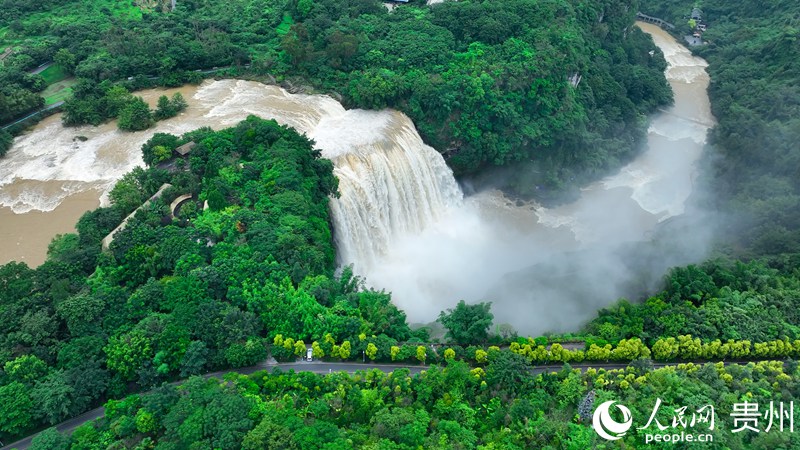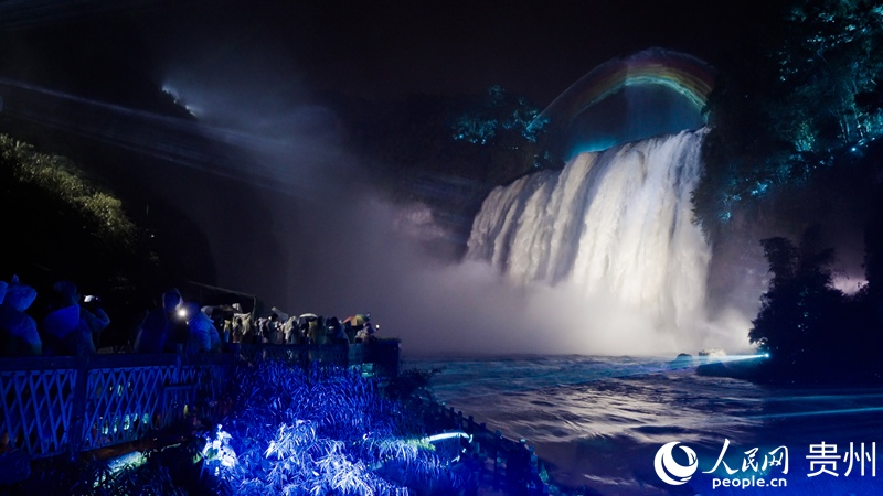 Desde junho, a Cachoeira Huangguoshu entrou na esta??o das cheias. No local, a cachoeira é majestosa ao cair da noite, efeitos sonoros e luminosos se intercalam, formando um belo cenário que integra organicamente ecologia e natureza, muito bem recebido pelos turistas.