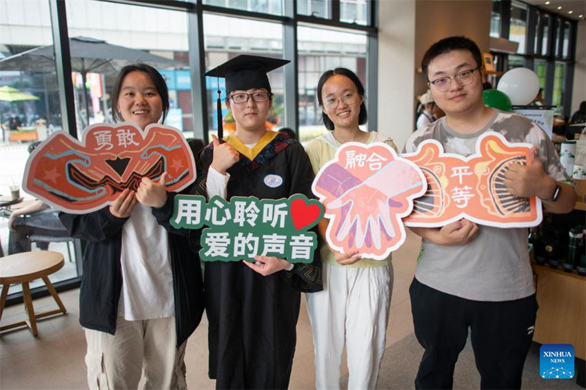 Dou Lingyun (2o à esquerda), formado em bioengenharia pela Universidade de Ciência e Tecnologia de Huazhong, posa para uma foto de grupo com colegas de classe num café Starbucks em Wuhan, província de Hubei, centro da China, em 18 de junho de 2024. (Foto: Wu Zhizun/Xinhua)
