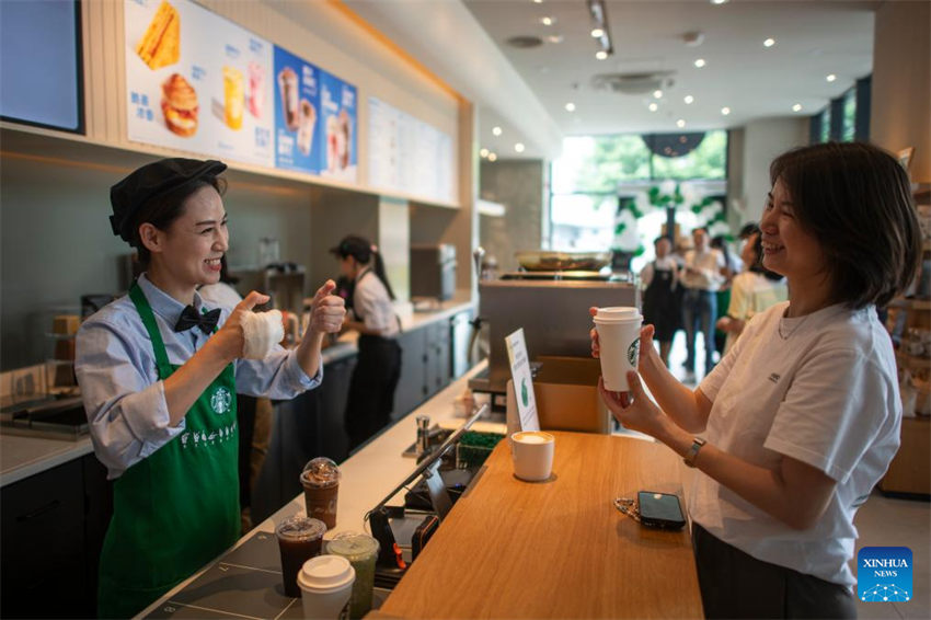 à primeira vista, este Starbucks na província de Hubei, no centro da China, poderia ser qualquer café moderno em qualquer lugar da China. No entanto, os recepcionistas e baristas do local s?o pessoas com deficiência auditiva e os métodos de comunica??o foram adaptados em conformidade.