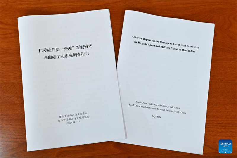 Um Relatório de Pesquisa sobre os Danos ao Ecossistema do Recife de Coral pelo Navio Militar Ilegalmente Encalhado em Ren'ai Jiao baseia-se em uma pesquisa científica realizada em abril deste ano sobre o ecossistema do recife de coral em Ren'ai Jiao e em suas áreas marítimas adjacentes pelo Centro Ecológico do Mar do Sul da China e pelo Instituto de Pesquisa de Desenvolvimento do Mar do Sul da China do Ministério de Recursos Naturais da China, juntamente com outros institutos.