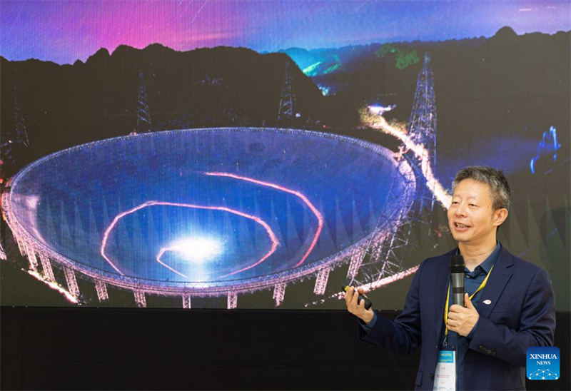 O radioastr?nomo chinês Li Di, cientista-chefe do Radiotelescópio Esférico de Abertura de Quinhentos Metros (FAST) da China, faz um discurso no 17o Encontro Marcel Grossmann em Pescara, Itália, em 9 de julho de 2024. (Xinhua/Li Jing)