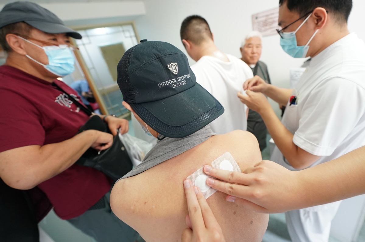 Pacientes recebem adesivos de moxabust?o sanfu no Hospital de Medicina Tradicional Chinesa de Beijing na segunda-feira. (Foto: Fang Fei/China Daily)