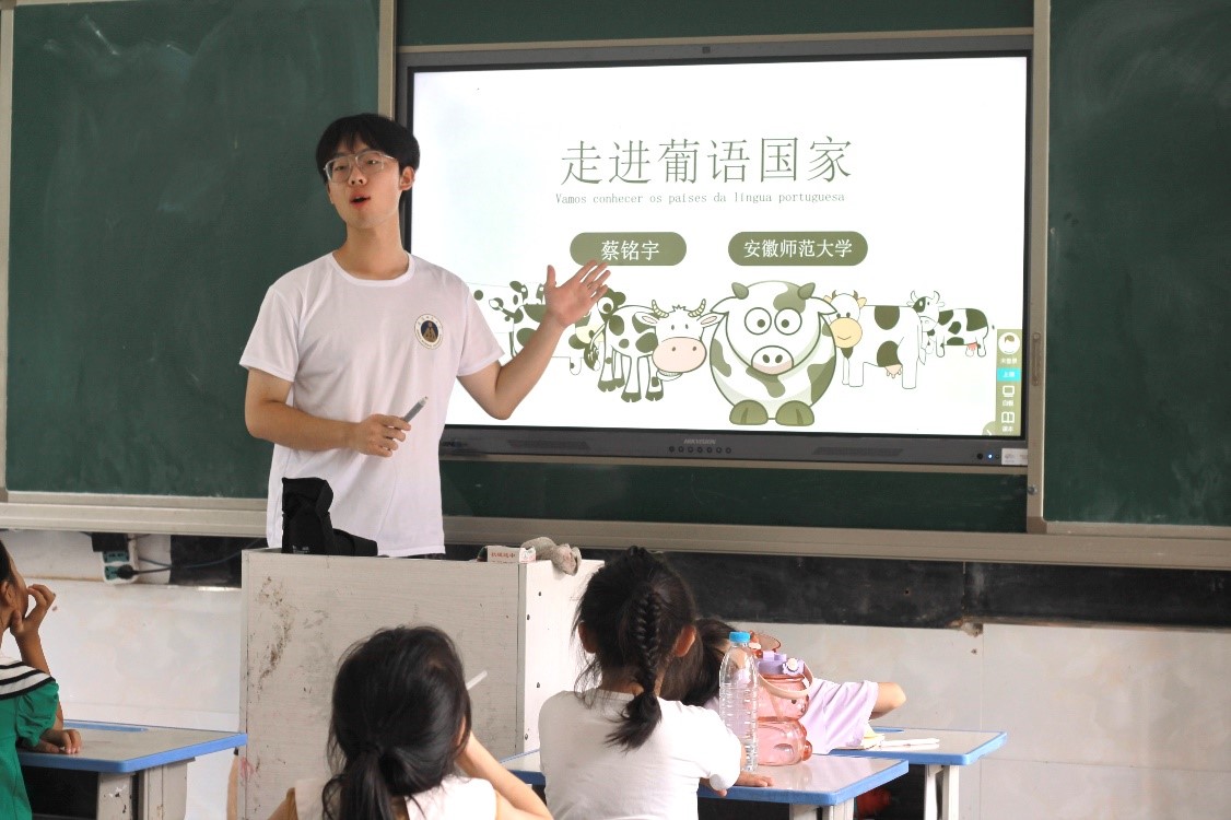 Entre os dias 9 e 18 de julho, uma equipe responsável por alunos do curso de português da Faculdade de Línguas Estrangeiras da Universidade Normal de Anhui realizou uma atividade de ensino voluntário de ver?o na vila de Maofan, da cidade de Anqing. O objetivo da atividade foi fortalecer a assistência à educa??o rural, introduzir mais recursos educacionais em vilas remotas nas montanhas e promover ativamente a revitaliza??o rural da China.