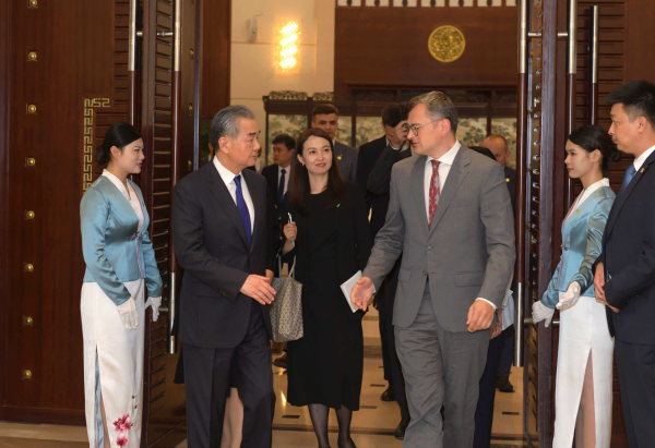 O ministro das Rela??es Exteriores da China, Wang Yi, conversou com o ministro das Rela??es Exteriores da Ucrania, Dmytro Kuleba, em Guangzhou, na quarta-feira, pedindo uma solu??o política da crise na Ucrania.