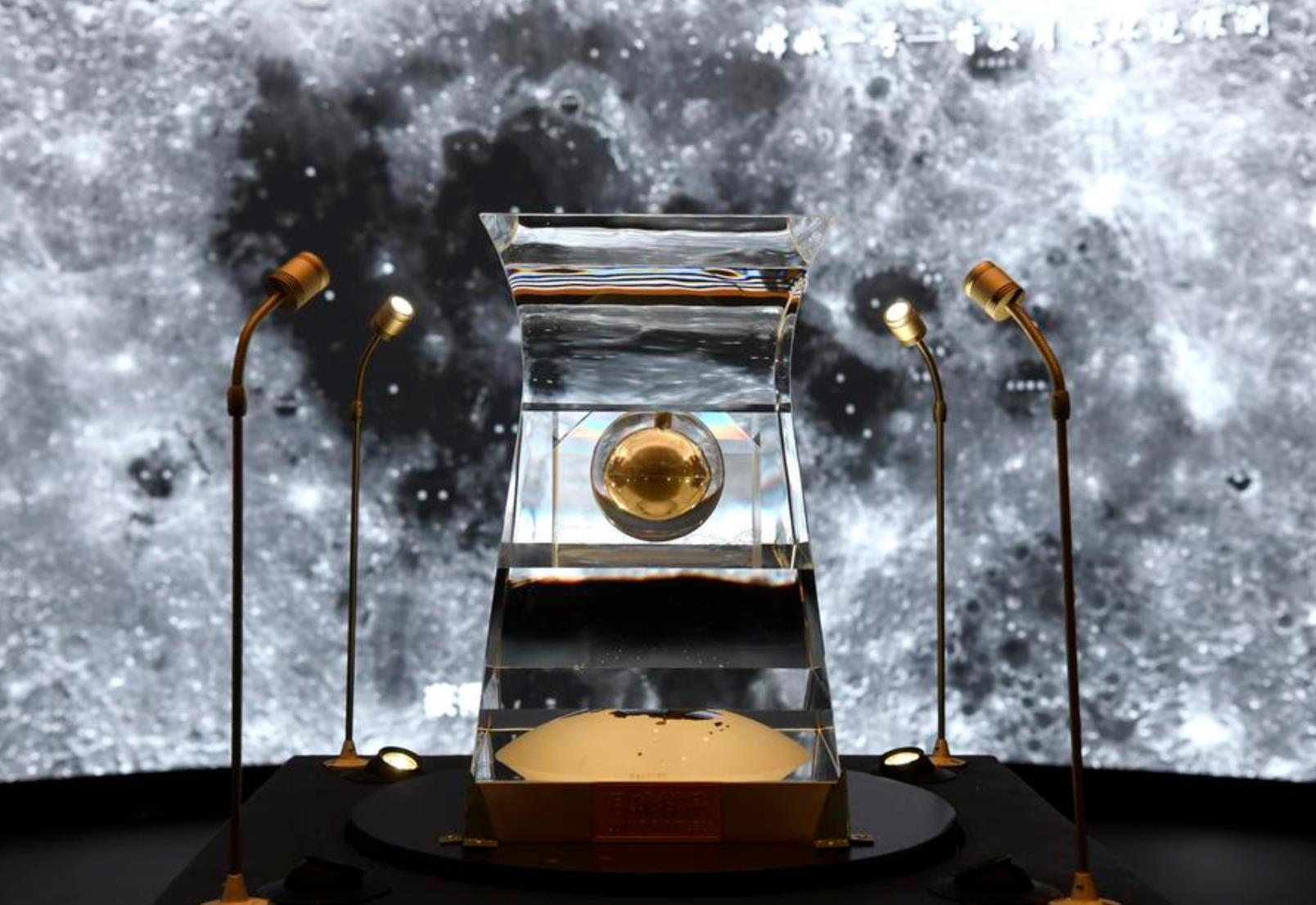A amostra lunar no 001, transportada pela sonda chinesa Chang'e-5, é exibida no Museu Nacional da China em Beijing, capital da China, em 27 de fevereiro de 2021. (Jin Liangkuai/Xinhua)