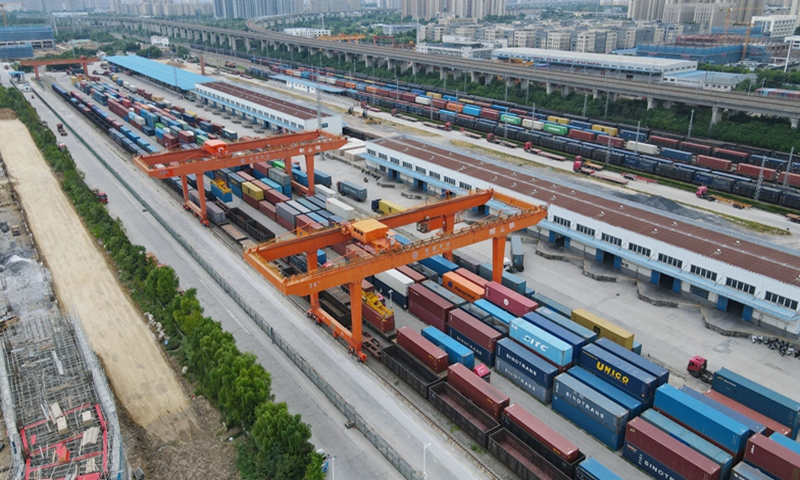 Base logística da esta??o ferroviária norte de Hefei, na província de Anhui, no leste da China. Um total de 380 trens de carga China-Europa partiram de Hefei entre janeiro e julho deste ano, marcando um aumento de 3% em rela??o ao ano anterior.