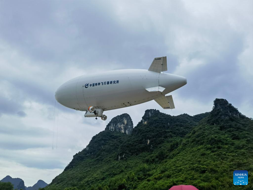 O dirigível civil tripulado AS700 chega a Guilin, na Regi?o Aut?noma da Etnia Zhuang de Guangxi, no sul da China, em 21 de agosto de 2024. (AVIC/Divulga??o via Xinhua)