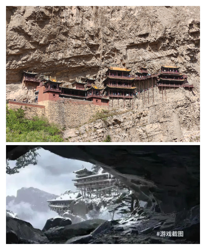 A foto mostra uma compara??o espantosa entre o Templo Suspenso na cidade de Datong da província de Shanxi, e uma cena criada com base nesse local no videogame "Black Myth: Wukong". (Fotos/Conta oficial do WeChat do Departamento de Cultura e Turismo da Província de Shanxi)
