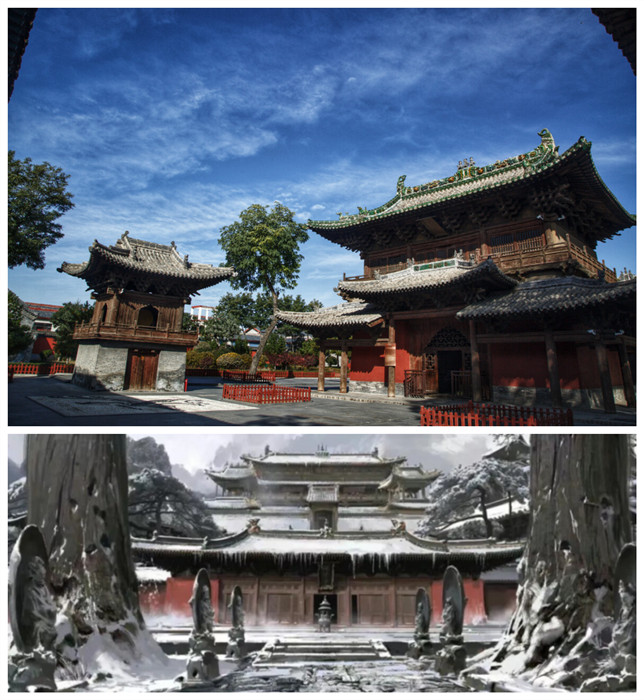 A foto mostra uma compara??o espantosa entre o Templo Chongfu na cidade de Shuozhou da província de Shanxi, e uma cena criada com base nele no videogame "Black Myth: Wukong". (Fotos/Conta oficial do WeChat do Departamento de Cultura e Turismo da Província de Shanxi)